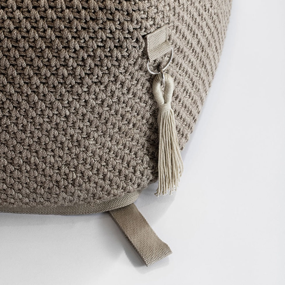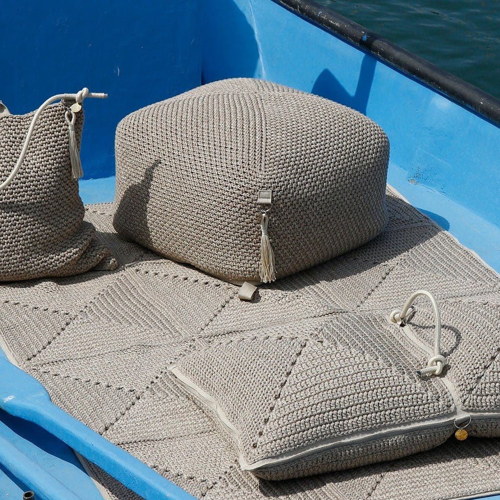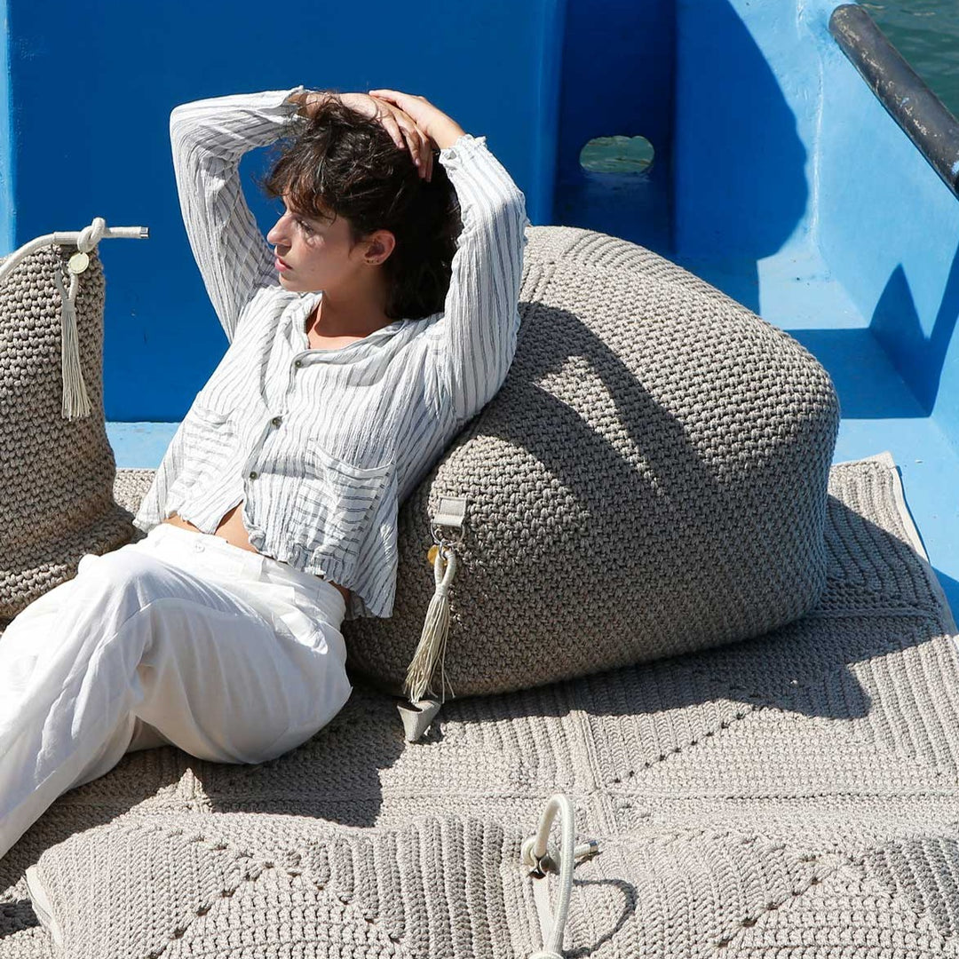 Materials: hand-knit outdoor UV protected acrylic, nickel parts, outdoor UV protected acrylic straps and polyester tassels.