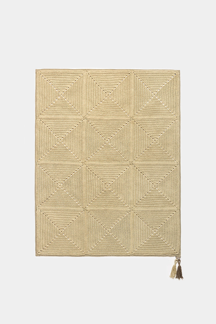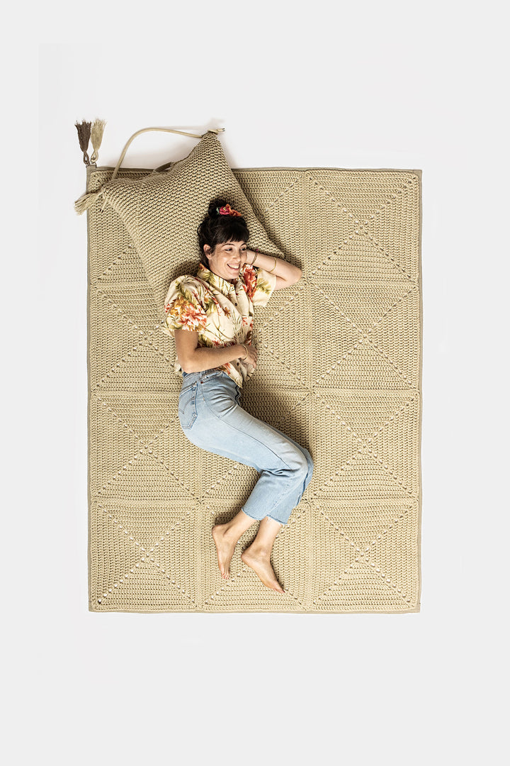 Materials: hand-knit outdoor UV-protected acrylic, nickel parts, outdoor UV-protected acrylic straps, and polyester tassels.